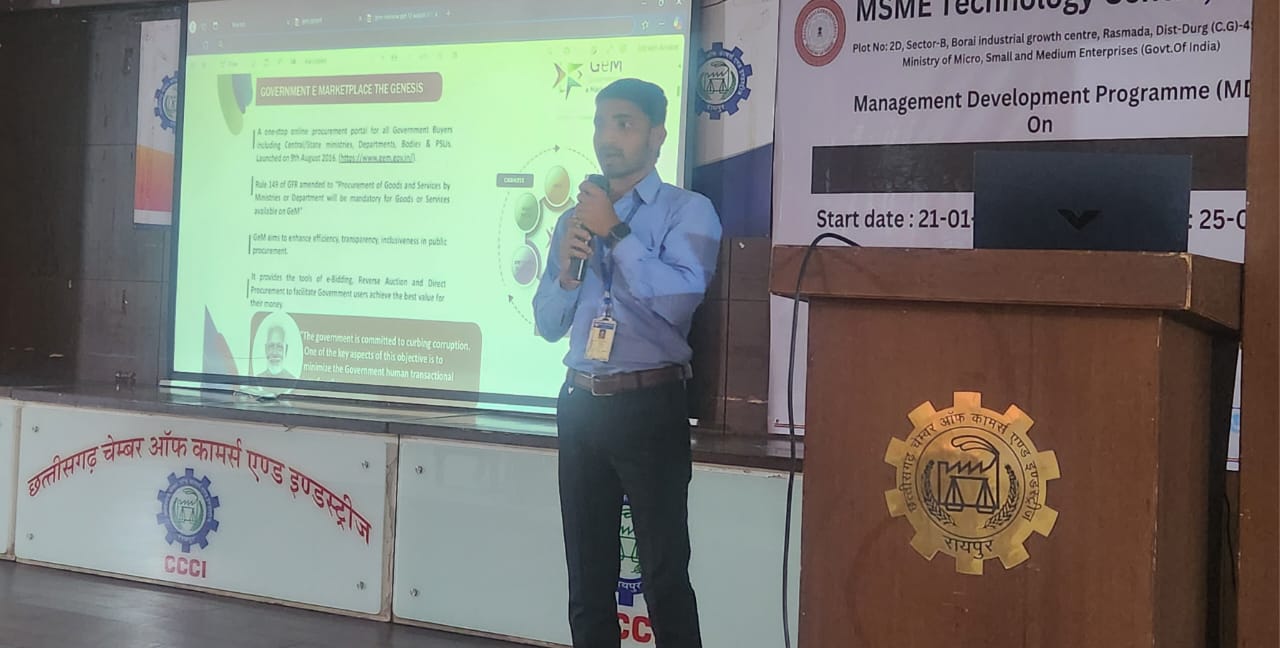 Events → छत्तीसगढ़ चेंबर ऑफ कॉमर्स एंड इंडस्ट्रीज तथा एमएसएमई के संयुक्त तत्वाधान में आयोजित मैनेजमेंट डेवलपमेंट प्रोग्राम में आज गवर्मेंट ई मार्केटप्लेस GeM पोर्टल को लेकर हुई कार्यशाला